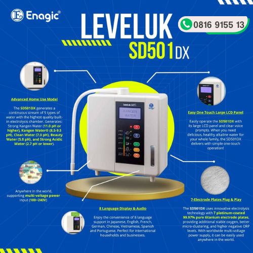LeveLuk SD501DX merupakan mesin kangen wate terbaru yang hadir sebagai model andalan Enagic yang banyak dipilih untuk penggunaan rumah tangga. Lima pelat berstandar medis di dalamnya menghasilkan air berkualitas tinggi dalam lima jenis pH berbeda, termasuk Kangen Water, Clean Water, Acid (Beauty) Water, Strong Kangen Water, dan Strong Acidic Water.
